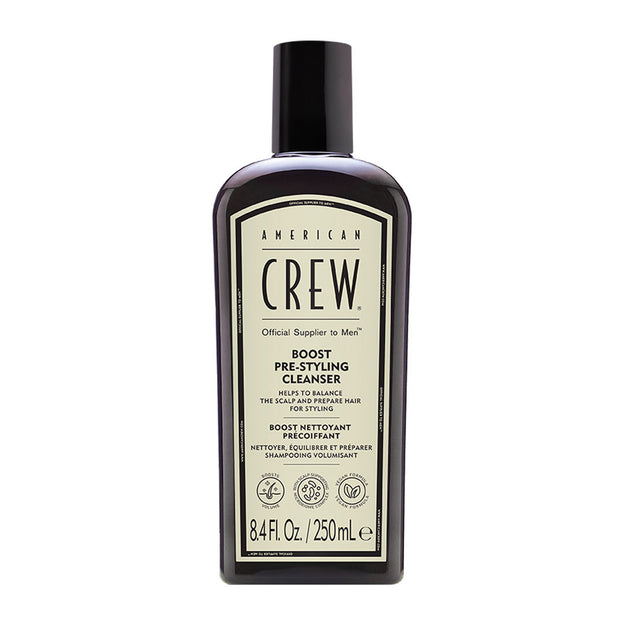 Introducing the new American Crew Pre-Styling Shampoo designed to cleanse and prep your client's hair for styling. The Boost Pre-Styling Cleanser is ideal fine or flat hair types that seek volume and fullness.