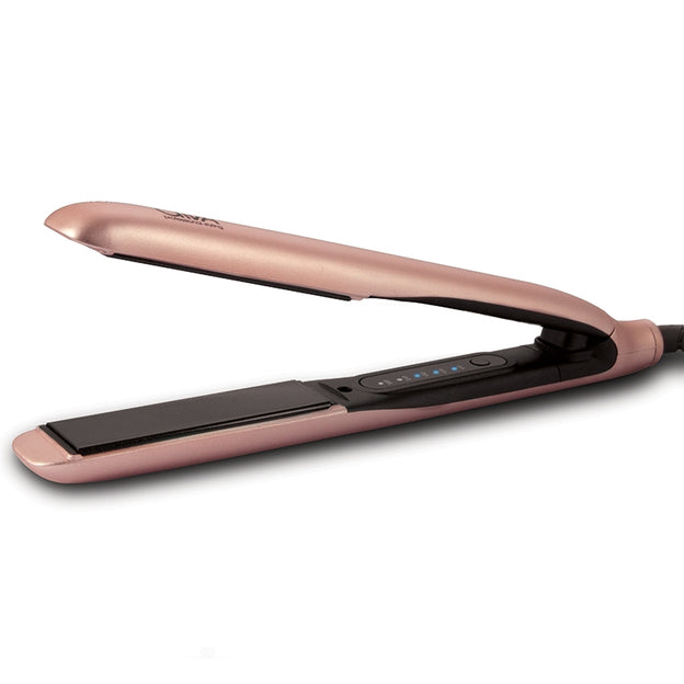 Diva Professional Touch Straighteners in Rose Gold feature Macadamia, Argan Oil & Keratin infused hot floating ceramic plates that glide effortlessly through the hair for a sleek & professional finish, a swipe Temperature Control Panel and digital variable heat 110°C to 235°C .