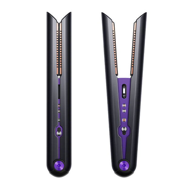 Dyson Corrale™ hair straightener in Black & Purple delivers the thermal performance of a corded straightener, cord-free. The only straightener with flexing copper plates that shape around the hair gathering it neatly together allowing you to create the same style with less heat for 50% less breakage1, less frizz and fewer flyaways2.