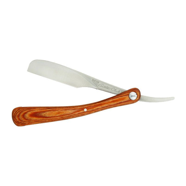 The Feather Artist Club DX Wood Razor in a warm wood finish is perfect for professional barbers. It features a stainless steel body for durability and a birch wood handle for a secure grip.