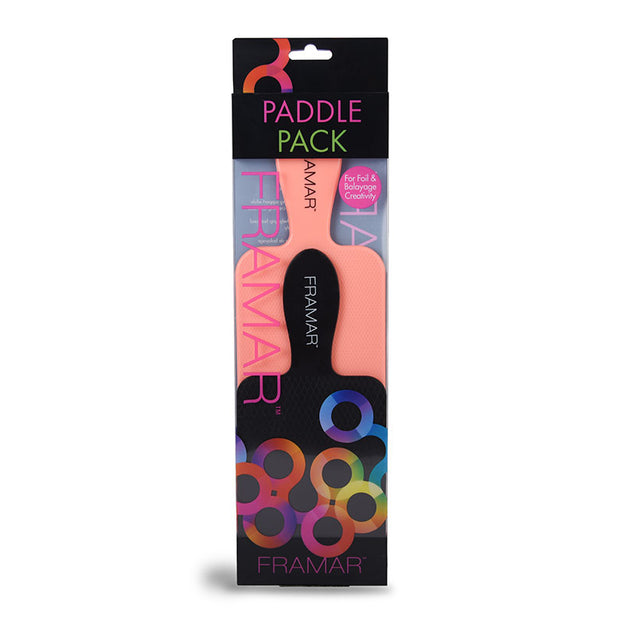 Framar Foil/Balayage Board and Paddle Set is for use with foils and balayage creativity. It comes with 1 foil/balayage board and 1 balayage paddle. It is exceptional for giving support while painting bleach or creating luxurious highlights. It has a grooved finish to help grip to the hair and spread colour evenly.