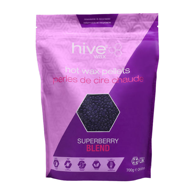 Hive Superberry Blend Hot Wax Pellets 700g is a premium wax that has a rich texture that can be spread thinly over large or small treatment areas in one step. The formulation has strong removal action without breakage with no wax strips required.