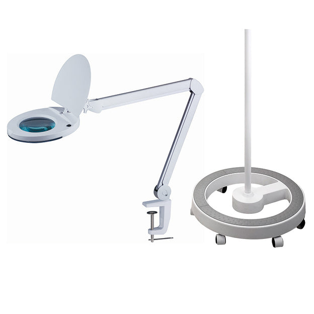 This LED Magnifying Lamp with Clamp and Stand is a super strong magnifying lamp with a 5 diopter glass lens (3x magnification). It has a large 5" diameter precision ground lens giving clear, strain-free viewing. It features 60 white non-glare, long life (8W) LED lights.