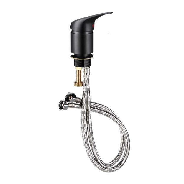 The Black Mixer Tap is a contemporary basin mixer with a brass valve core, long supply hose, hot and cold connections and an outlet connection.