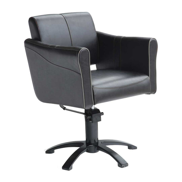 The Lotus Chilton Black Styling Chair has a curved and comfortable design with grey piping accents. Available with a choice of 6 customisable bases including our 3 standard hydraulic bases - Silver Round, Square & 5 star or for an additional cost in Black 5 Star, Gold Round or Silver Motorised.