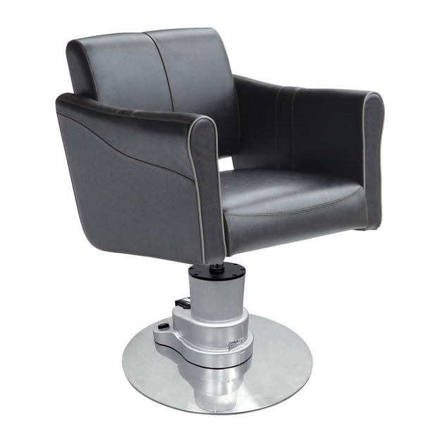 The Lotus Chilton Black Styling Chair has a curved and comfortable design with grey piping accents. Available with a choice of 6 customisable bases including our 3 standard hydraulic bases - Silver Round, Square & 5 star or for an additional cost in Black 5 Star, Gold Round or Silver Motorised.