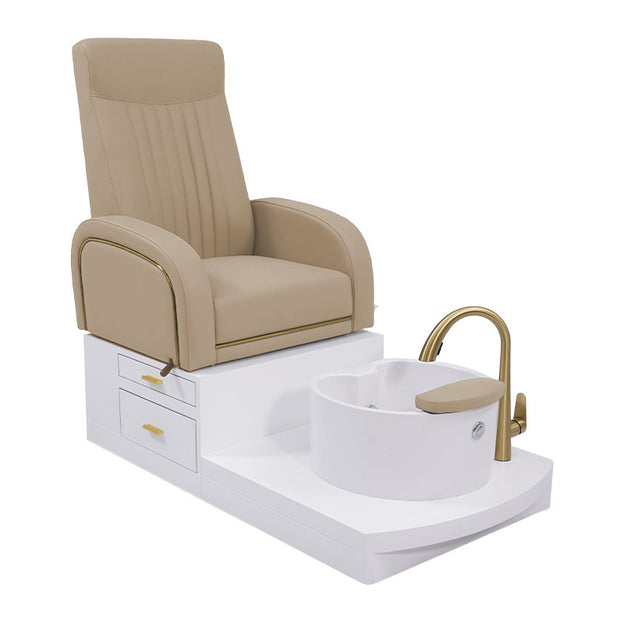 The SkinMate Darcy Sand Pedicure Spa Chair is a spa chair designed to elevate professional pedicure spaces. Finished in a soft sand upholstery with distinctive gold trim, featuring a sliding seat, built-in storage drawers, and an elegant spa bowl with a gold tap. Ideal for salons looking to create a premium client experience with comfort and convenience at the core.