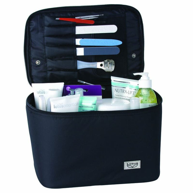 This Nylon Vanity case in black has a zip fastened lid and roomy compartments for all your accessories. Dimensions: H19.5 x W29 x D19.