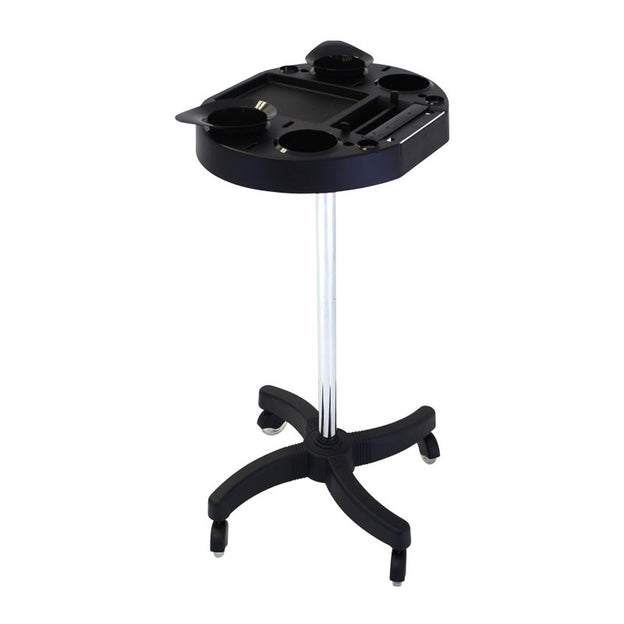 Stable black plastic base with chrome pole and large easy clean, hair-free castors. Comes complete with foil dispenser, versatile top tray with multiple function and bowls.
