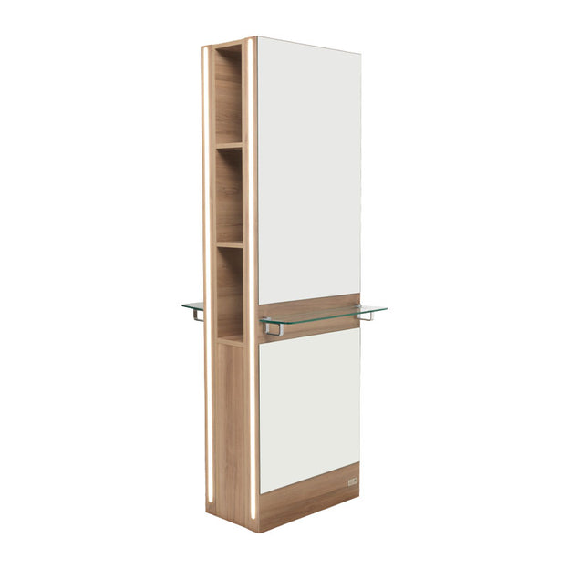 The Destiny island unit has a double sided mirror to create two work stations, it is a refined, floor length Styling Station with a distinctive modern aesthetic, also available as a single wall mounted unit. Features include a toughened glass shelf with chrome brackets, LED lights to the unit sides, and an optional frosted panel on the lower section.