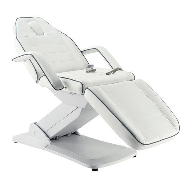 The REM Excel Three Motor Electric Couch features motorised adjustment of height, backrest angle and seat tilt all controlled by a handset. It comes with a facehole and infill along with removable arm rests. Available in white White with Grey piping.