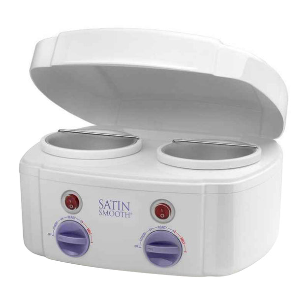 The Satin Smooth Professional Double Wax Heater features enhanced regulated temperature controls, providing individual heat settings including 'Standby', 'y', and 'Melt' mode. This design offers users full control and the option to heat one or two wax pots separately.