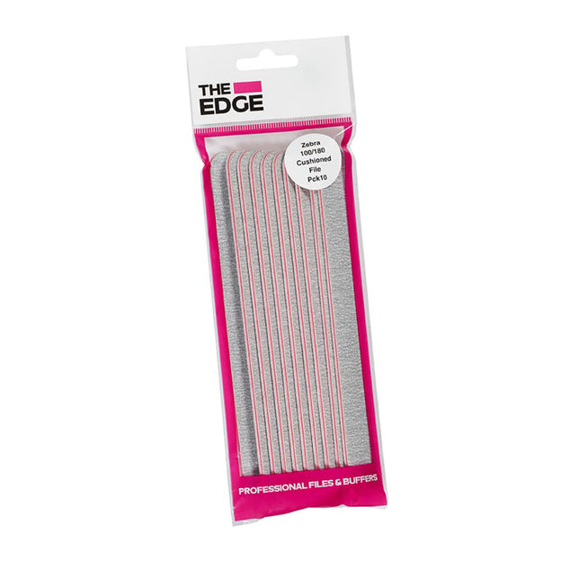 The Edge Zebra 100/180 Grit File (x 10) is a cushioned non-washable file that is soft on cuticles and highly recommended for surface work and filing the edge of the nail. These popular Zebra patterned files are made from Zinc Searate and resist clogging from acrylics. Also available in singles.